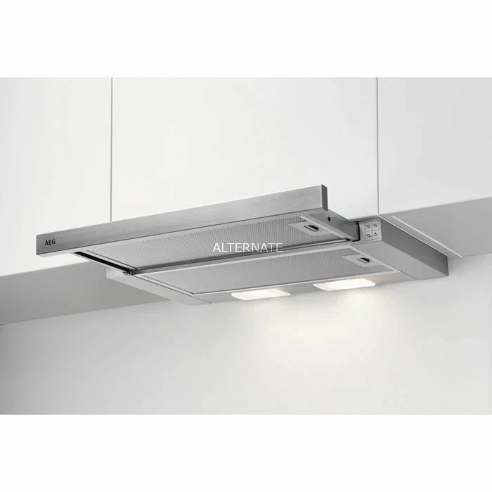 Die Dunstabzugshaube AEG DPB2621S ist für den Einbau in einen Oberschrank über dem Kochfeld geeignet und nur sichtbar, wenn sie benötigt wird. Sie kann beim Kochen herausgezogen werden, um den Absaugmotor einzuschalten, und führt den aufsteigenden Dampf vom Kochfeld mit drei Leistungsstufen schnell und restlos ab. Über mechanische Drucktasten lassen sich bei der 60 cm breiten Flachschirmhaube alle Leistungsstufen sowie die Arbeitsplatzbeleuchtung mit zwei LED-Lampen à 4 Watt komfortabel steuern. Die DPB2621S verfügt über zwei Aluminium-Fettfilter und kann wahlweise im Abluft- und Umluftbetrieb genutzt werden.