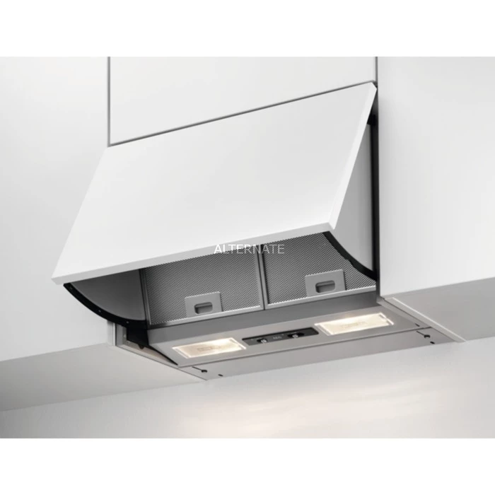 Die Dunstabzugshaube AEG DEB2631S ist für den Einbau in einen Oberschrank über dem Kochfeld geeignet und nur sichtbar, wenn sie benötigt wird. Sie kann aufgeklappt werden, um den Lüfter während des Kochvorgangs einzuschalten, und führt den aufsteigenden Dampf vom Kochfeld stufenlos und mit einer Intensivstufe schnell und restlos ab. Über Schiebeschalter lässt sich die 60 cm breite Einbauhaube präzise und intuitiv steuern. Die Arbeitsplatzbeleuchtung besteht aus zwei LED-Lampen à 3 Watt. Die DEB2631S verfügt zudem über zwei Aluminium-Fettfilter und kann wahlweise im Abluft- und Umluftbetrieb genutzt werden.
